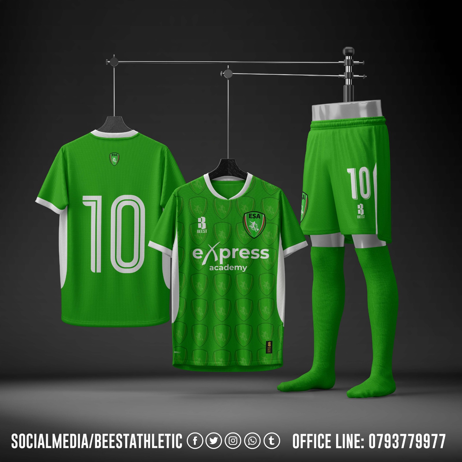 Unleash the spirit of the pitch in the official Express Soccer Academy Green Set. This high-performance kit features a sophisticated, tonal geometric ‘ESA’ pattern sublimated into a vibrant emerald green base. Engineered by Beest Athletic with moisture-wicking fabric and breathable white side-ventilation panels, it is designed to keep you cool and agile from the first whistle to the last. Complete with the iconic Express Academy logo and bold white numbering, this set is the ultimate expression of academy pride.”